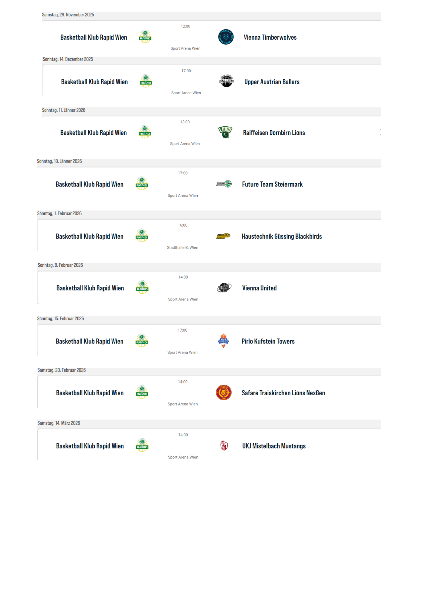 - Alle weiteren Heimspiele werden in der Sport Arena Wien, 1020 Wien ausgetragen.